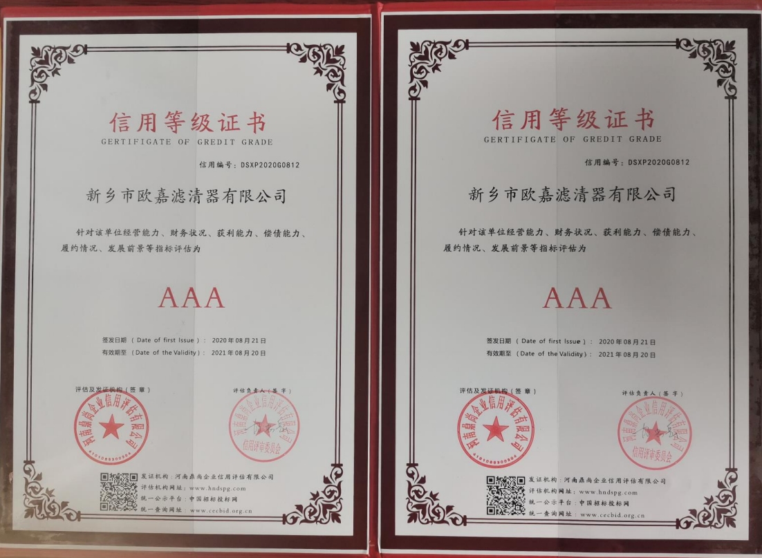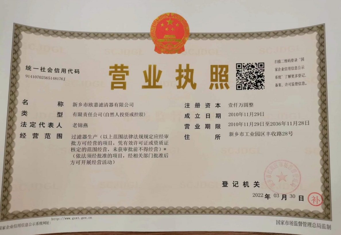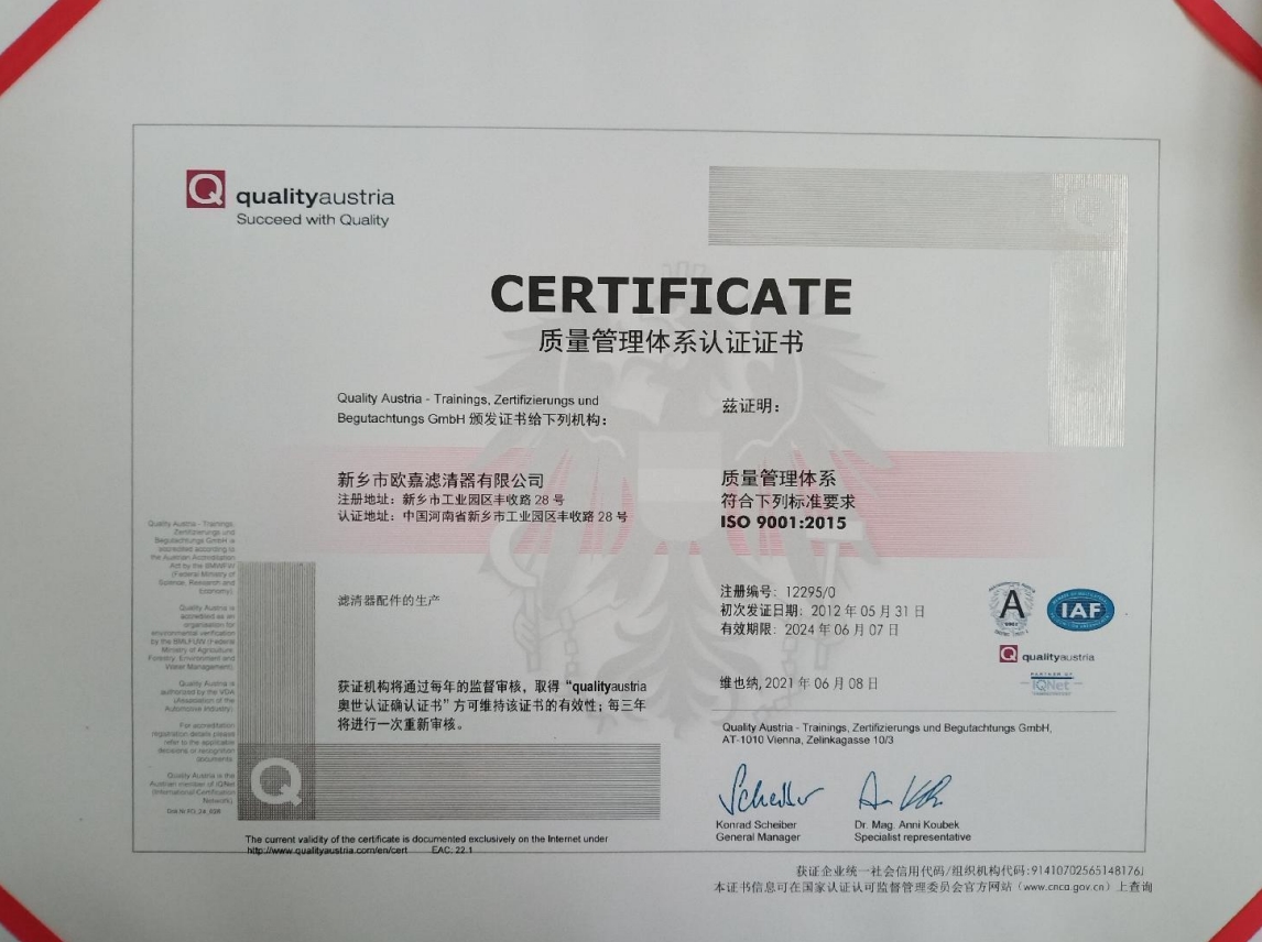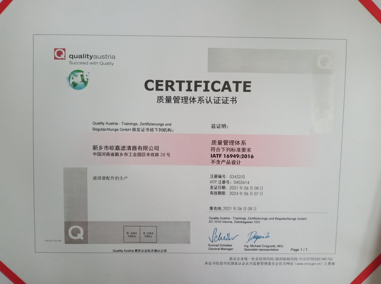 公司简介新乡市欧嘉滤清器有限公司成立于2010年11月29日,公司产品服务于多元化的动力与设备市场,包括:汽车、工程机械、船舶、摩托车、割草机、农机等过滤系统。系列产品分为:过滤器、滤芯、过滤设备、液压附件、检测设备等五大类,构建了完整的产品矩阵,以满足客户不同层次的需求。公司年产汽车三滤三千万套、过滤总成三千套、各种工业油滤一千多套、片滤二万套,应客户要求可提供液压系统、润滑系统既含有特殊要求的过滤配件,实际年产值三千多万。目前与多家规模较大的企业合作,是新乡市平原滤清器有限公司定点供货商。产品出口到泰国、越南等地,技术力量雄厚、设备先进、其中:pu生产线三条,方块滤折纸生产线两条,圆滤生产线三条。研发新产品快,检测手段完善,保障体系健全,企业已经通过了IATF16949:2016 IS09001:2015质量管理体系认证证书。这些质量保证体系的有效运行,使企业产品质量在本地区同行业始终处于优势地位。