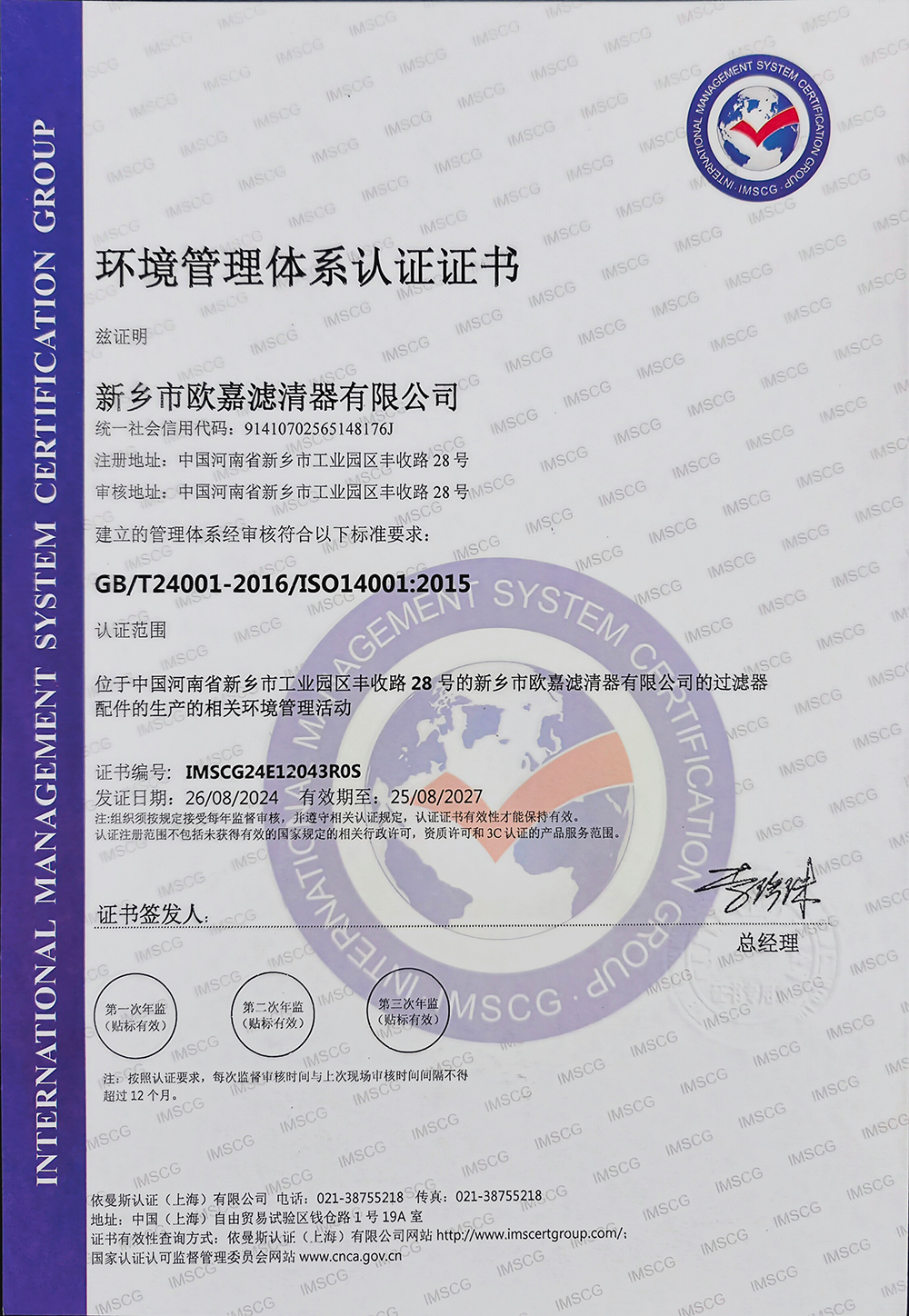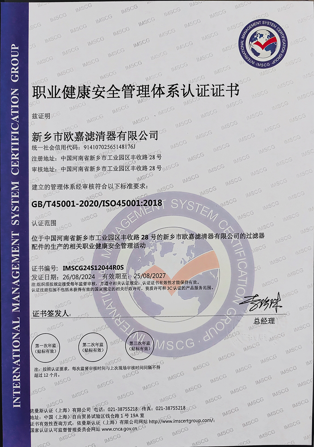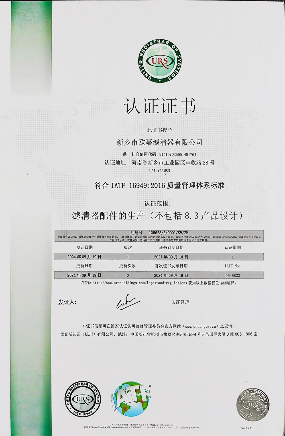 公司简介新乡市欧嘉滤清器有限公司成立于2010年11月29日,公司产品服务于多元化的动力与设备市场,包括:汽车、工程机械、船舶、摩托车、割草机、农机等过滤系统。系列产品分为:过滤器、滤芯、过滤设备、液压附件、检测设备等五大类,构建了完整的产品矩阵,以满足客户不同层次的需求。公司年产汽车三滤三千万套、过滤总成三千套、各种工业油滤一千多套、片滤二万套,应客户要求可提供液压系统、润滑系统既含有特殊要求的过滤配件,实际年产值三千多万。目前与多家规模较大的企业合作,是新乡市平原滤清器有限公司定点供货商。产品出口到泰国、越南等地,技术力量雄厚、设备先进、其中:pu生产线三条,方块滤折纸生产线两条,圆滤生产线三条。研发新产品快,检测手段完善,保障体系健全,企业已经通过了IATF16949:2016 IS09001:2015质量管理体系认证证书。这些质量保证体系的有效运行,使企业产品质量在本地区同行业始终处于优势地位。